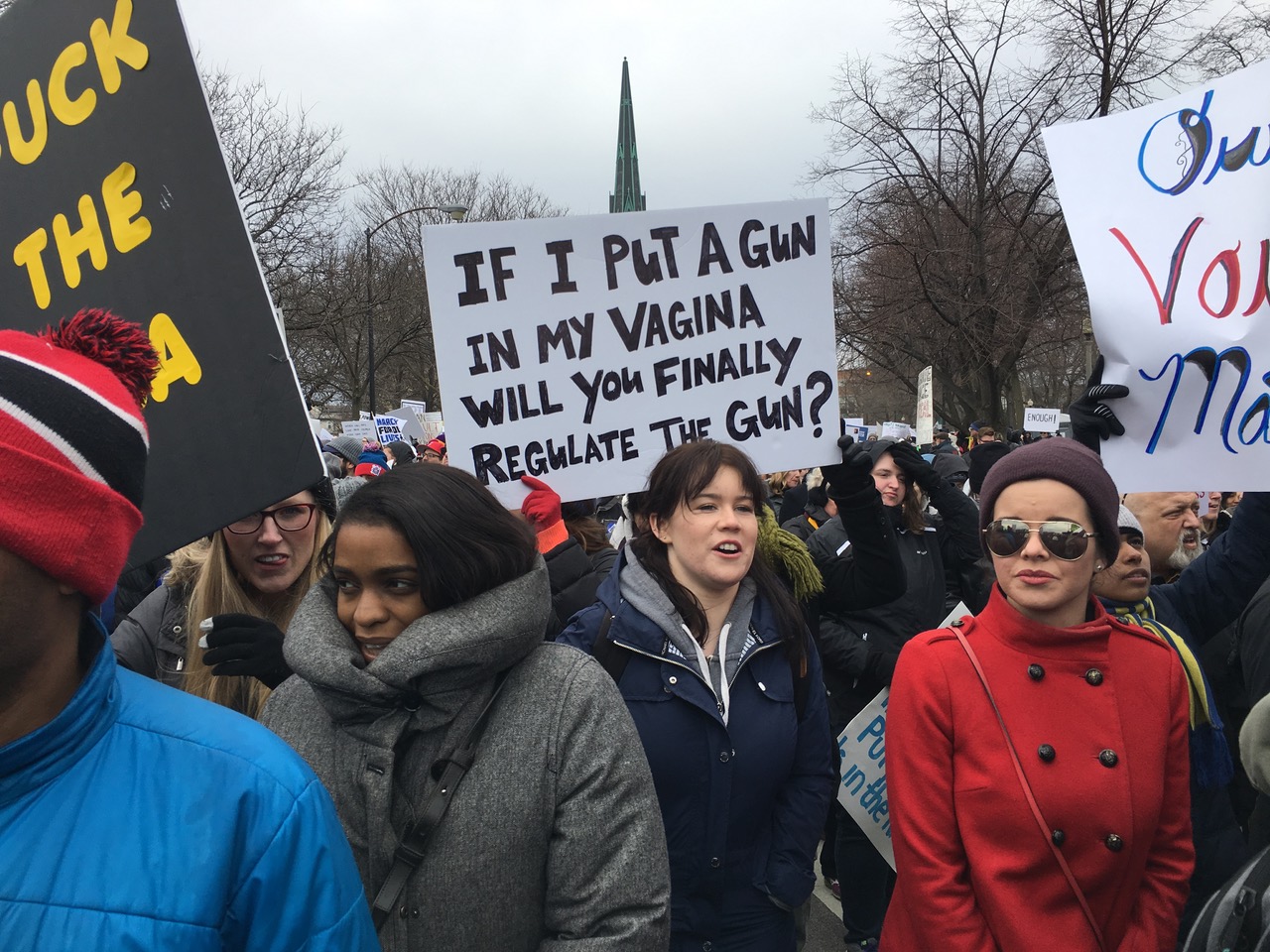 Naomi Wadler and many other speakers drew attention to victims of gun violence who are different from Parkland’s middle class suburban high school, African Americans in the cities. Students from Marjorie Stoneham Douglas High School met with students at Thurgood Marshall Academy in DC. They had already come to Chicago to talk to black student activists and victims of gun violence. Then they told us what they learned, using the language of intersectionality and privilege. They reminded audiences that mass shootings and school shootings are a fraction of the gun deaths, that media attention focused on them but not on slain African Americans, and they demanded empathy and action for all the gun victims.